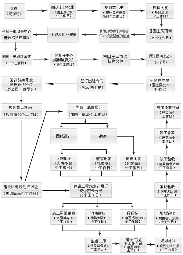 中国基本建设流程中,立项是国内基本建设流程的重要的一步,对于在县一级政府投资的工业项目(以北京密云为例),项目方的推动项目得流程如下。: